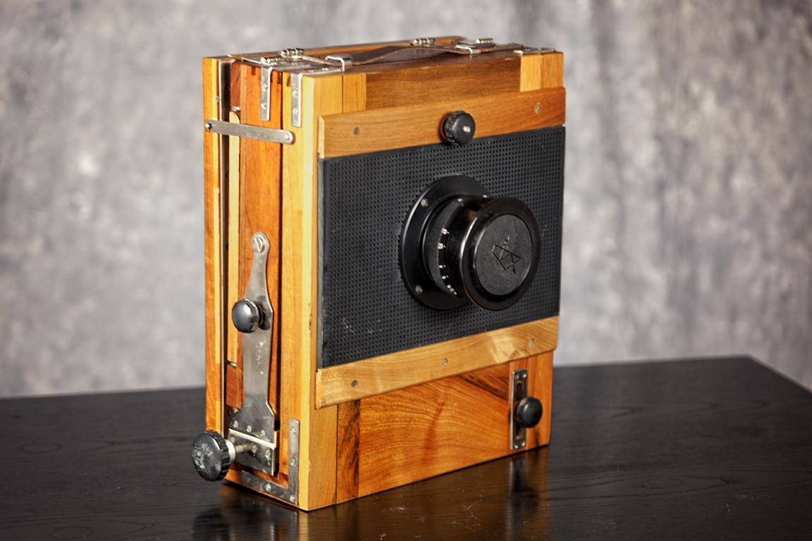 The lens is an Industar-51, produced in Kazan, USSR (today Russia, Republic of Tatarstan), by KOMZ with f4.5/210mm. It comes without shutter, exposure is done by opening the lens cap.